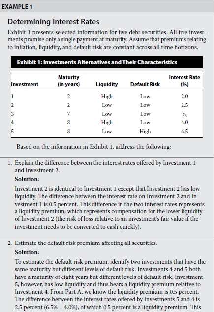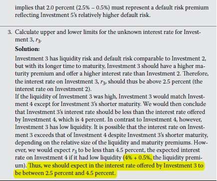 Module 1-书P7-Example 1-1. Solution 2中, Investment 4和5的流动性溢价,为什么等于Investment 1和2的流动性溢价?这两组的maturity (in years) 并不一样,一个是2年,另一个是8年。2. Solution 3中,为什么投资3和投资2的流动性风险会相等?为什么两者的default risk也相等?3. Solution 3的最后一句话,为什么Investment 4的expected interest rate的上限是4.5%?为什么只需要在投资4的4.0%利率的基础上加上个流动性风险溢价0.5%就可以了?难道不用再考虑投资3比投资4的Maturity (in years)低的情况了吗?另外,投资3和投资4的default risk 都是 low, 所以默认投资3和投资4的default risk是相等的?为什么投资3和投资4之间的流动性风险溢价等于投资1和投资2之间的流动性风险溢价0.5%?