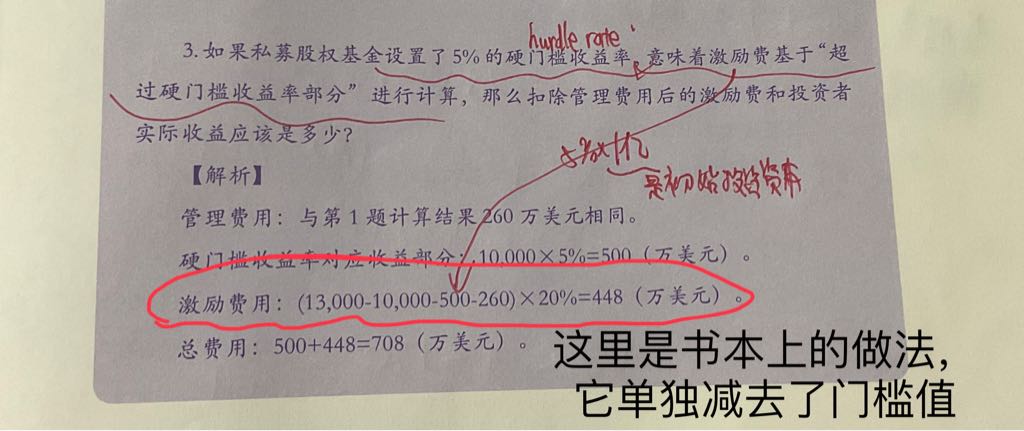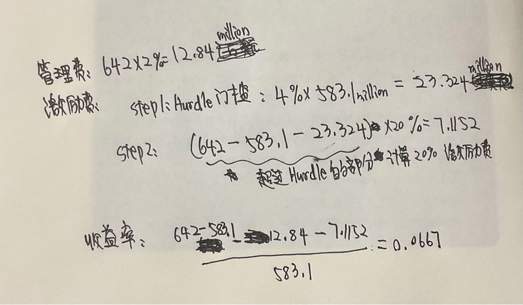 老师你好,请问我这个做法为什么不对?我按照书本上的做法,把hurdle rate乘初始资本价值得出门槛值再计算激励费。可是为什么在这里不能这么做?