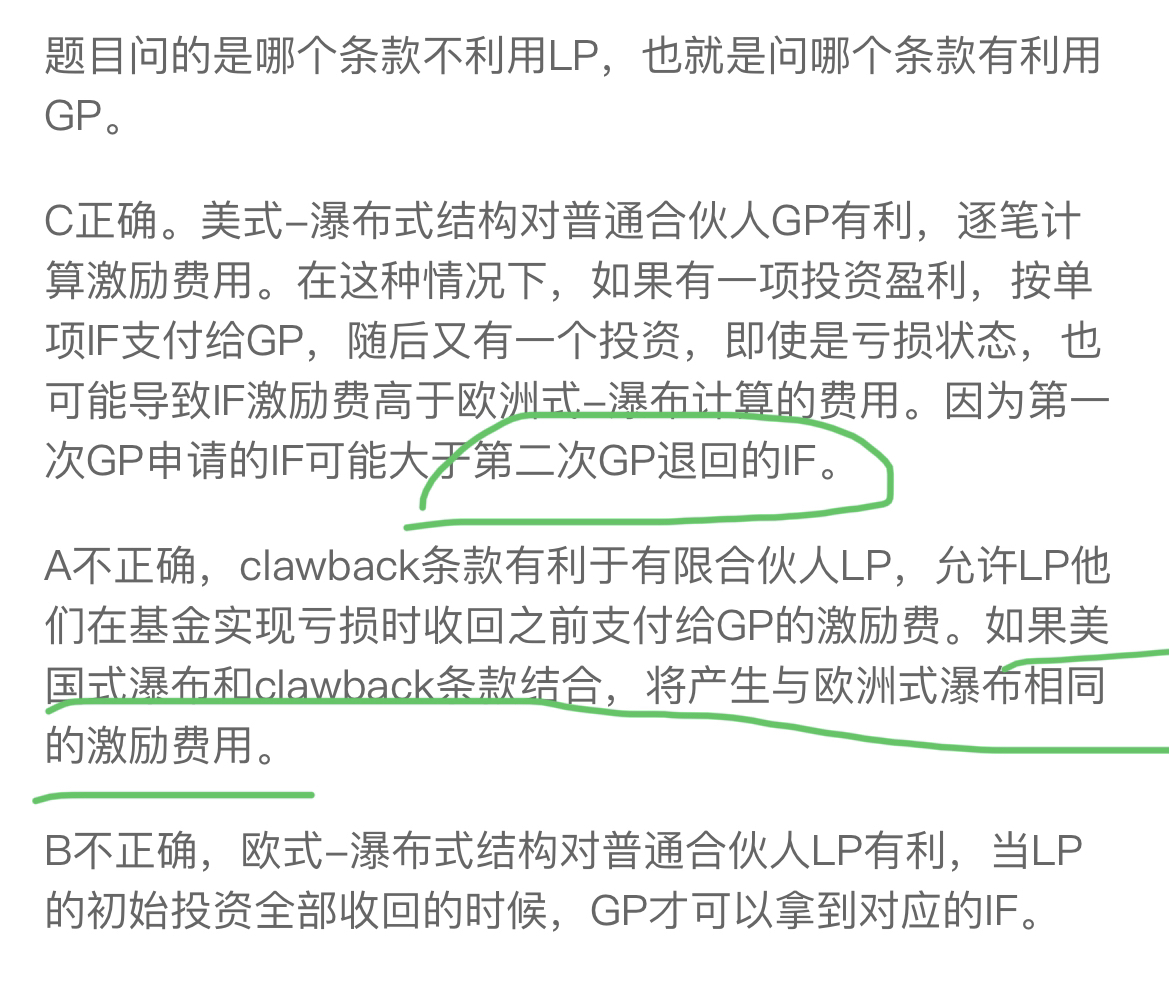 老师,美式有个地方我没懂,如果第一个投资有盈利,GP可以拿到IF(激励费);如果第二个投资出现亏损,GP则拿不到IF(问题:在这种情况下,GP会因为第二个投资出现亏损而还给LP他们在第一个投资里收到的IF吗?)。第二个问题,为什么美式和clawback结合就等于欧式?