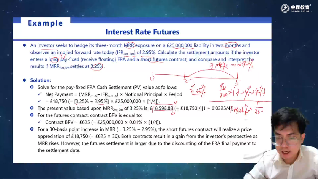 - 对于老师讲的这部分,1. 我理解FRA的Payoff始终等于利率期货的Payoff部分进行折现(除以1个大于1的数),也就是说,FRA的Payoff的变动幅度 应该 始终小于利率期货的变动幅度。2. 至于是涨多跌少,还是涨少跌多,其实MRR在分母上,可以根据1/x的曲线特点来理解,无非就是MRR上升时1/(1+MRR)的变动幅度 小于 MRR下降时1/(1+MRR)的变动幅度,所以如果MRR上升时,Payoff是上升的,那么就是涨少跌多,如果MRR上升时,Payoff是下降的,那就是涨多跌少。以上2点,我理解的对吗?