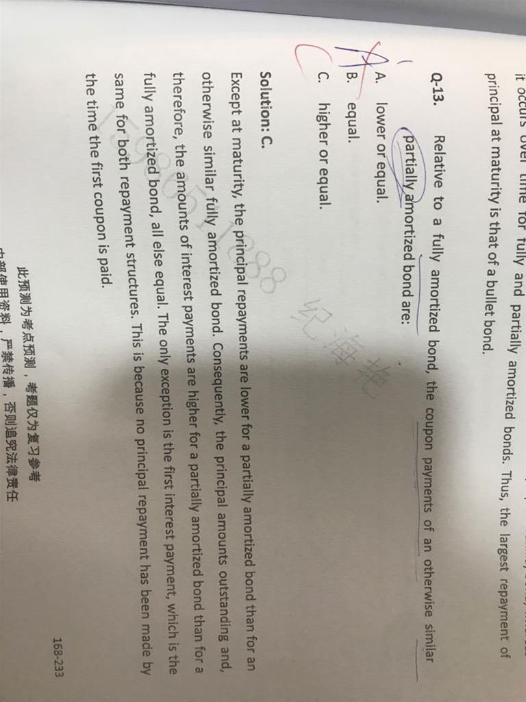 13.不是应该选lower吗,与本金完全摊销的债券相比,部分摊销的债券的PMT不是更低吗,这样理解有没问题,解答这个思路还有这道题,谢谢
