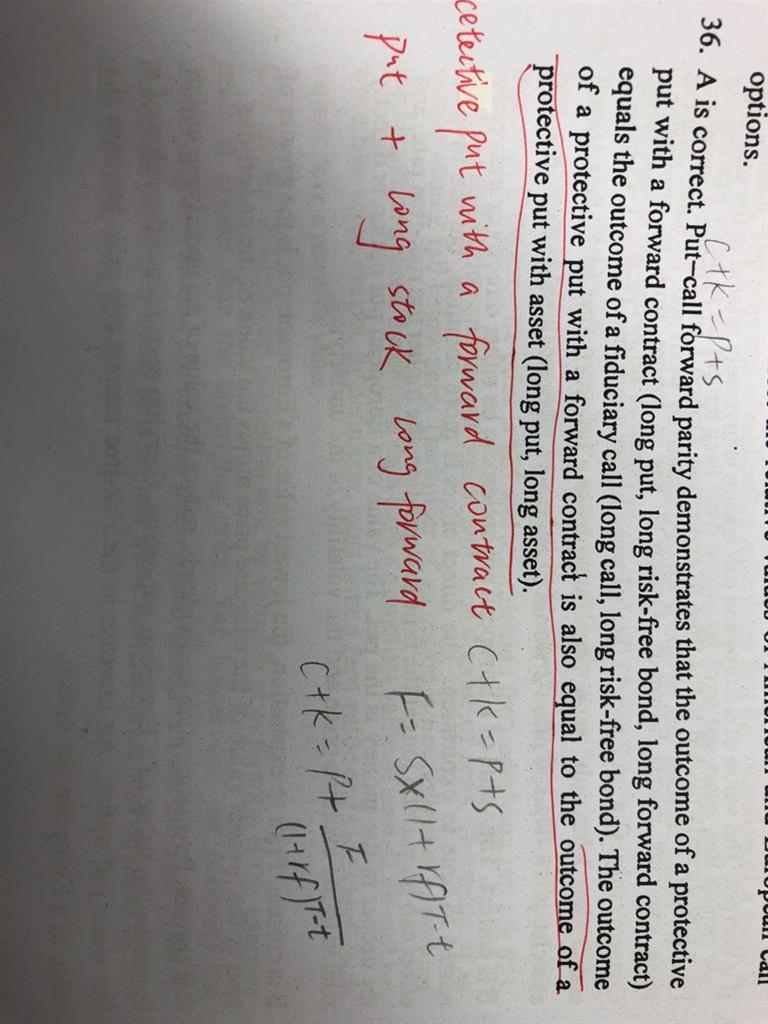 已解决老师您好,这道题是关于put call forward parity的知识点,我的理解是 forward parity 就是在原有的ck=ps中把s用forward price 表示出来了,也就是在protective put中long forward。但是答案说 forward parity 中protective put 还long 了一个 bond。为什么这样啊?