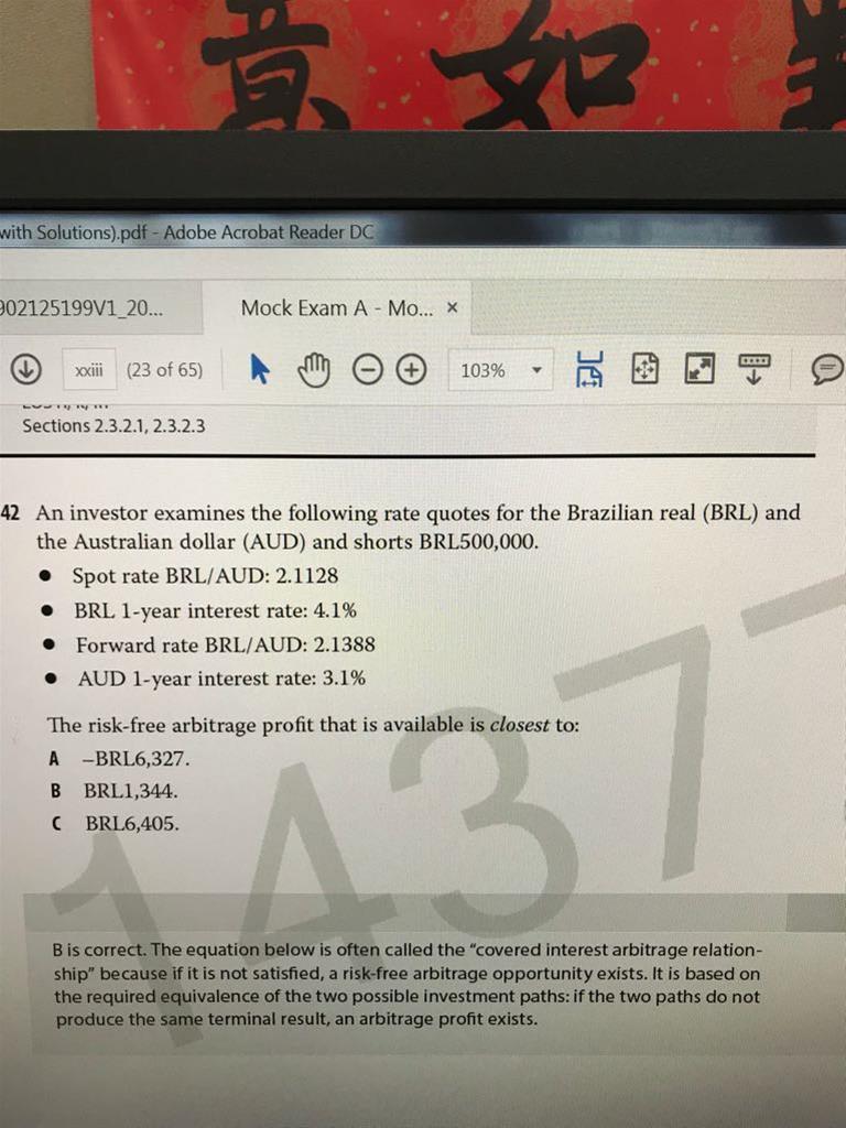 老师请问一下这一题应该要怎么算?我用arbitrage profit公式计算出BRL/AUD为1096.84,但需要用BRL来表示利润的话应该要乘以一个rate吧?应该用forward rate吗?