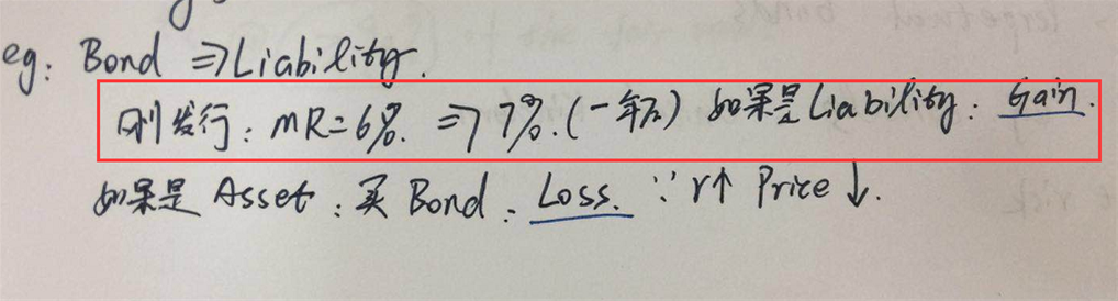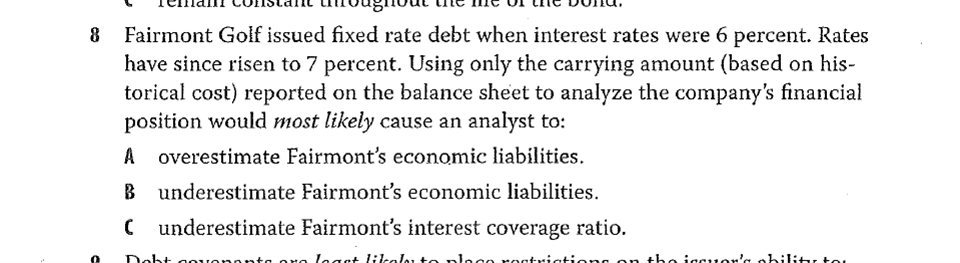 这道题,答案解释的刚发行时候市场利率是6,后来市场利率变成7了,因为利率上涨,债券价格下跌,由于BS上是用carrying Value记的,债券的carrying Value的值比市场价格高了,因此是高估,应选A。但是纪老师上课的时候讲过,如果市场利率6变成7,如果是liability的话,就是Gain,是Asset,是Loss,这个题目是issued债券,是属于Liability。为什么两个结论是反的?
