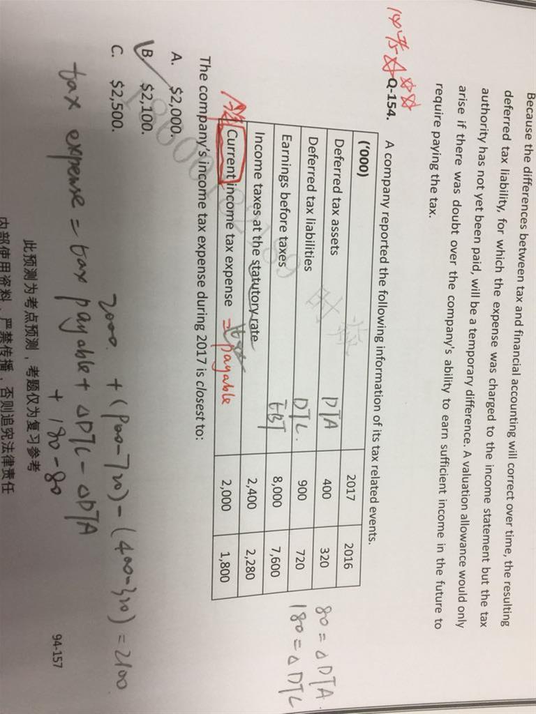 CFA1级百题,Q154。想不明白的是:tax payable为何等于current income tax expense呢,谢谢老师