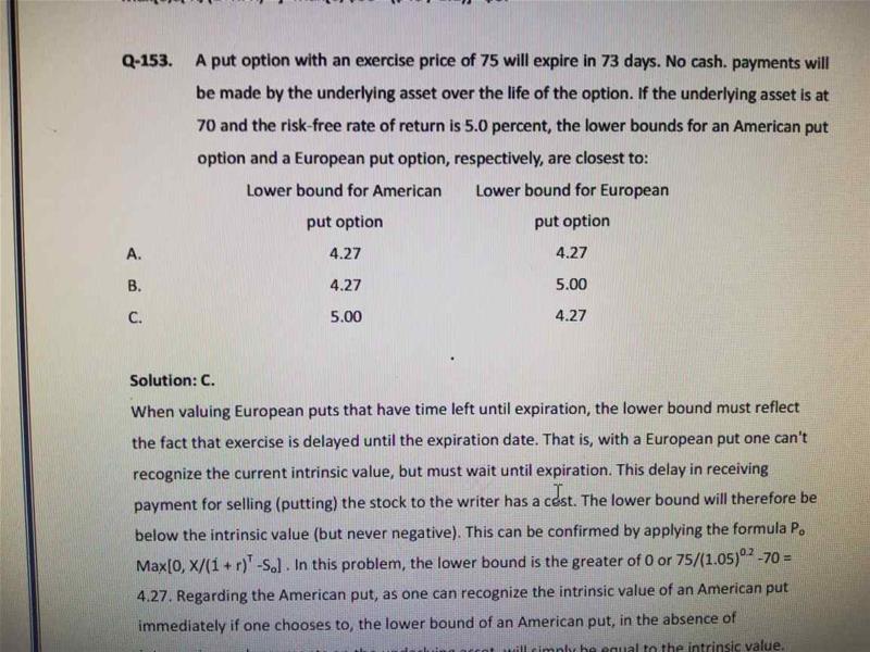 你好,百题第153,本题对美式期权不理解,题目这个BOUND是什么意思,题目问得是期权费吗,欧式而理解了,是因为欧式不能时时刻刻行权,就要算一个折现,但是美式还不明白。