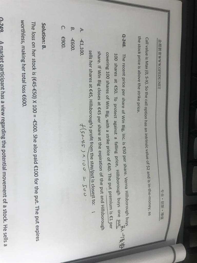有点不明白这道题目, 第一,以50元的现价买入,担心价格下跌,为什么是买入一个卖出资产的权利?而不是买入一份低价买入的权利做空?是止损吗? 第二,后来他以45元卖出,还要加上期权费,是因为他没有按照行权价执行,所以要加100元行权费?