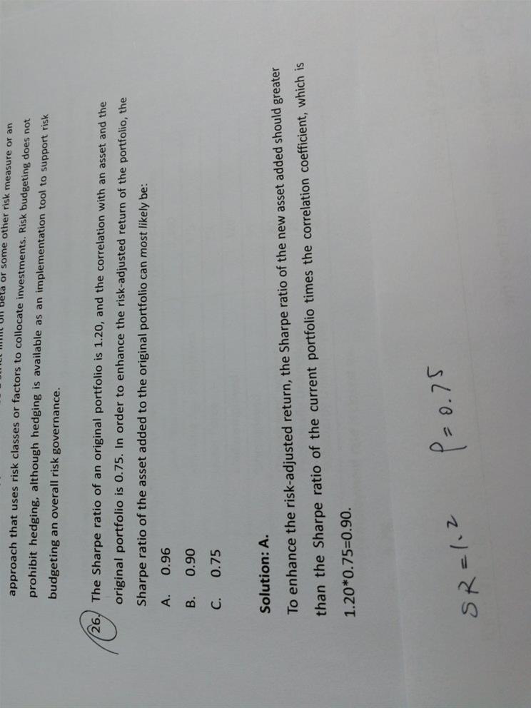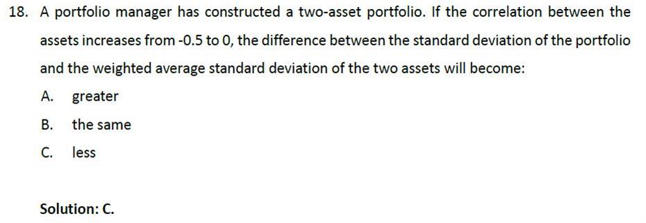 已回答我对“the difference between the standard deviation of the portfolio and the weighted average standard deviation of the two assets”的解读是:σp - (W1σ1 +W2σ2) ; 当时我在做题的时候,这样分析的: (W1σ1 +W2σ2)不变,σp变大,所以σp - (W1σ1 +W2σ2)变大,即greater; 单老师的对这句话的解读是:|σp - (W1σ1 +W2σ2)| ,是加了绝对值的,那么:在考试的时候,我对“the difference between A and B”这句话的解读,到底是加绝对值 |A - B| ,还是不加绝对值 A - B 呢?