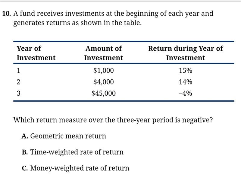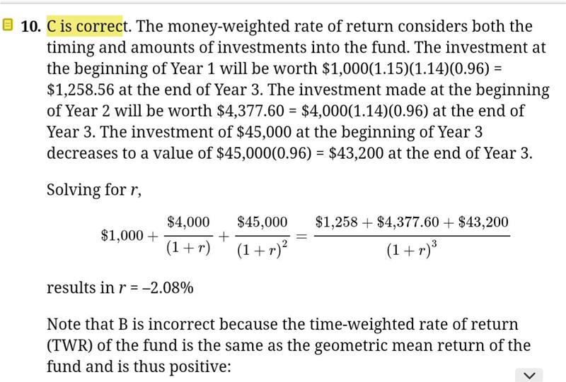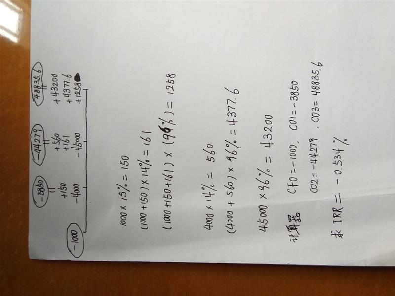 老师您好,这是原版书后题,如果要算题中的MWRR,按照答案中的计算式一元三次方程很难解,我就想把题目中的现金流算出来,然后用金融计算器算出IRR,可是得出的结果和答案中的不一样,请问我是哪里算的不对?