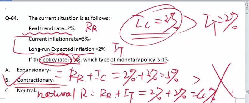 老师,这里我一直不明白,如果policy rate大于了neutral rate,policy rate是央行要盯住的市场利率(银行借款利率),那要使policy rate低一点,达到neutral rate的水平,5%降到4%,让市场利率降低,那不是应该是扩张政策吗?虽然这里说因为预期通胀大于了目标通胀率,需要采取紧缩的政策,但这两个结论不就矛盾了吗?