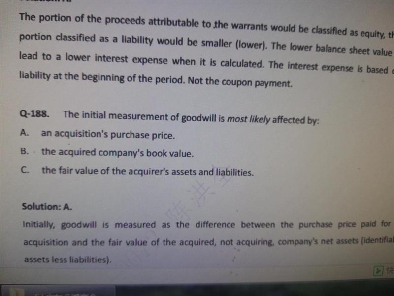 你好百题里188,这里我能否简单理解,商誉,例如公司要收购中原地产,除了财务尽职调查有一个市场价值,人家还愿意按照一个高一点采购价格去收购,就是因为看到这里无形好的商誉价值,这个差价就是简单理解商誉,说白了,好公司好名声公司,有些价值不能资产负债表衡量,