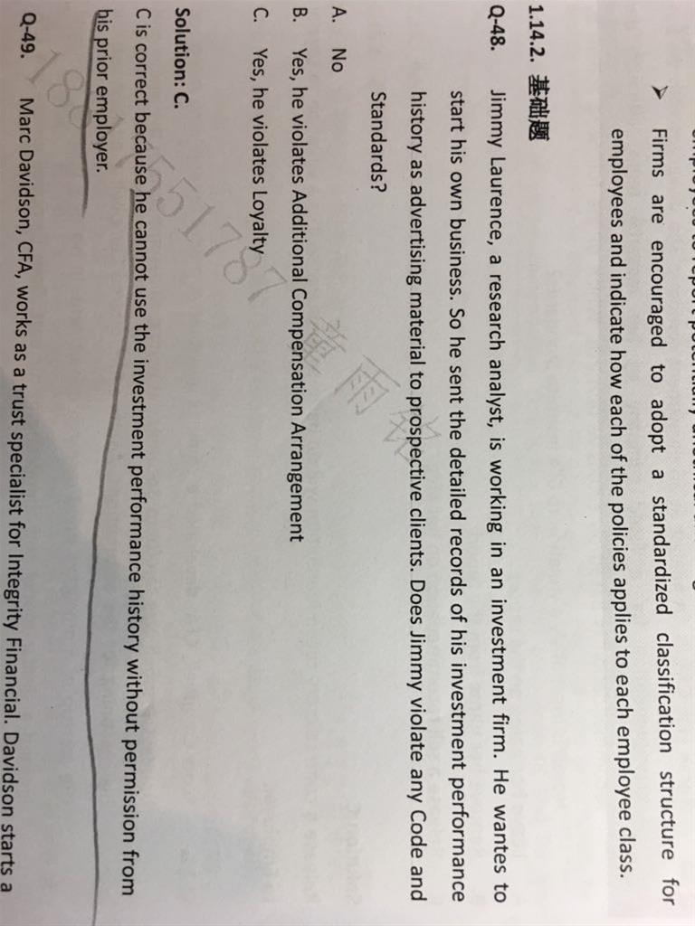 我怎么觉得这里答案有点问题 ,是因为competitive business才要向雇主申请批准吧,这里显然还没离职。离职后investment performance history 就没必要去申请原雇主同意了吧,不然离职了历史业绩都没法展示了多尴尬