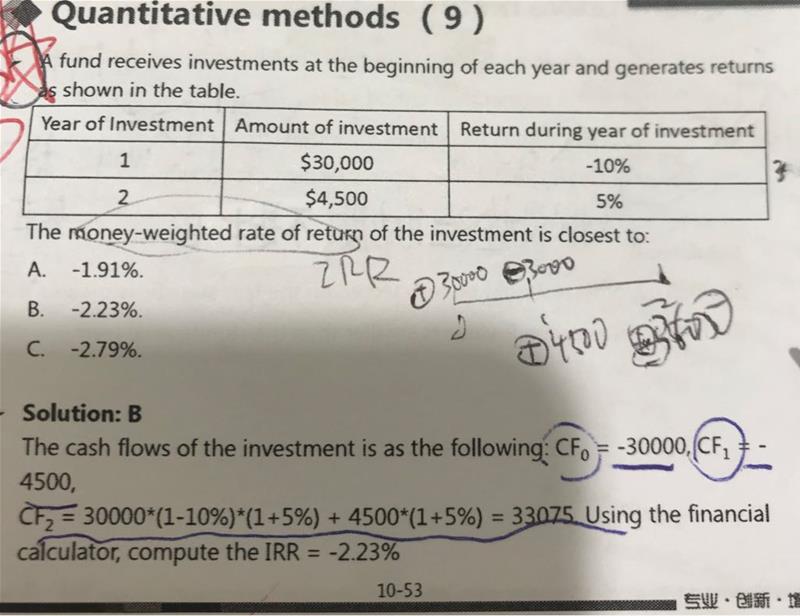 老师 为什么第一年投资之后的return:30000*(-10%)=-3000没有计算在第一年末的现金流流出呢?也就是说题目中CF2=-4500+3000=-1500???