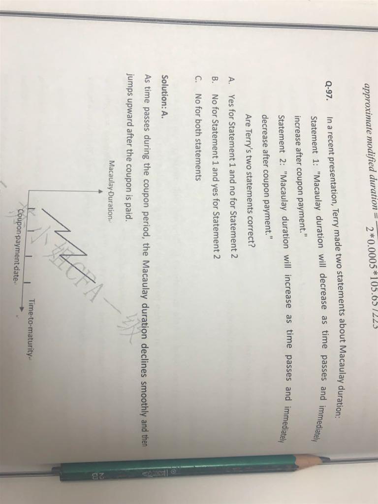 这是百题的题目。我看图理解Macaulay duration 是先上升,在coupon payment时突然下降,为什么答案截然相反?