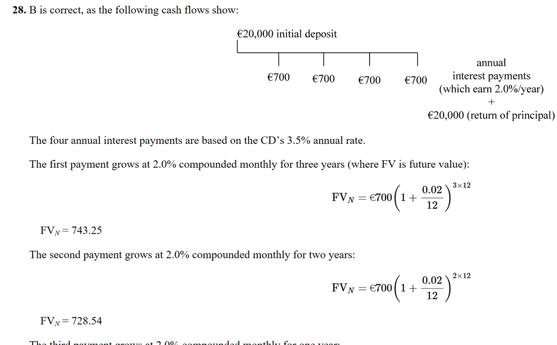 已回答原版书后题,一开始我用年金计算方式计算N=36,I/Y=2/12,PMT=-700,PV=0,求FV,算出来不对,看了答案才意识到36期并不是每一次计息时刻都有现金流,请问这4组700现金流属于年金吗?它们的计息时间间隔与现金流时间间隔不同。