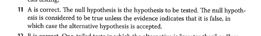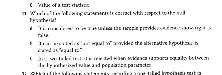 1、A选项是 to be true是否太绝对了?只是不能拒绝啊。 2、C选项没看懂什么意思。双尾检验,当证据支持hypothesized value and population parameter相等时候会被拒绝?hypothesized value 和 population parameter是什么东西?假设的值和总体的参数?