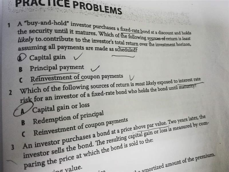查看试题 已回答原版书后题第259页第2题,主要是A和C我认为都是一样的,因为是持有到期,那资本到期是固定PAR VALUE ,但是每期的COUPON 也是固定收到的,根据发行说好的COUPON RATE计算,这有什么风险? 所有东西都是固定的,没有提前赎回。