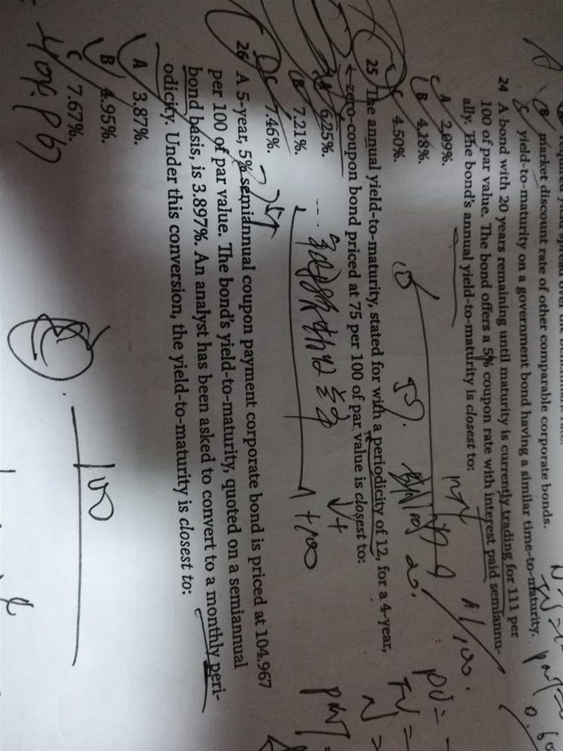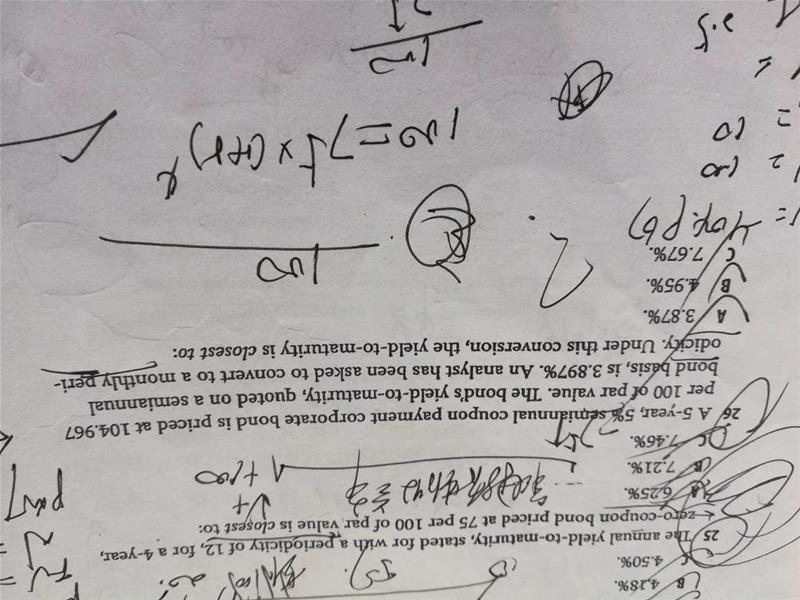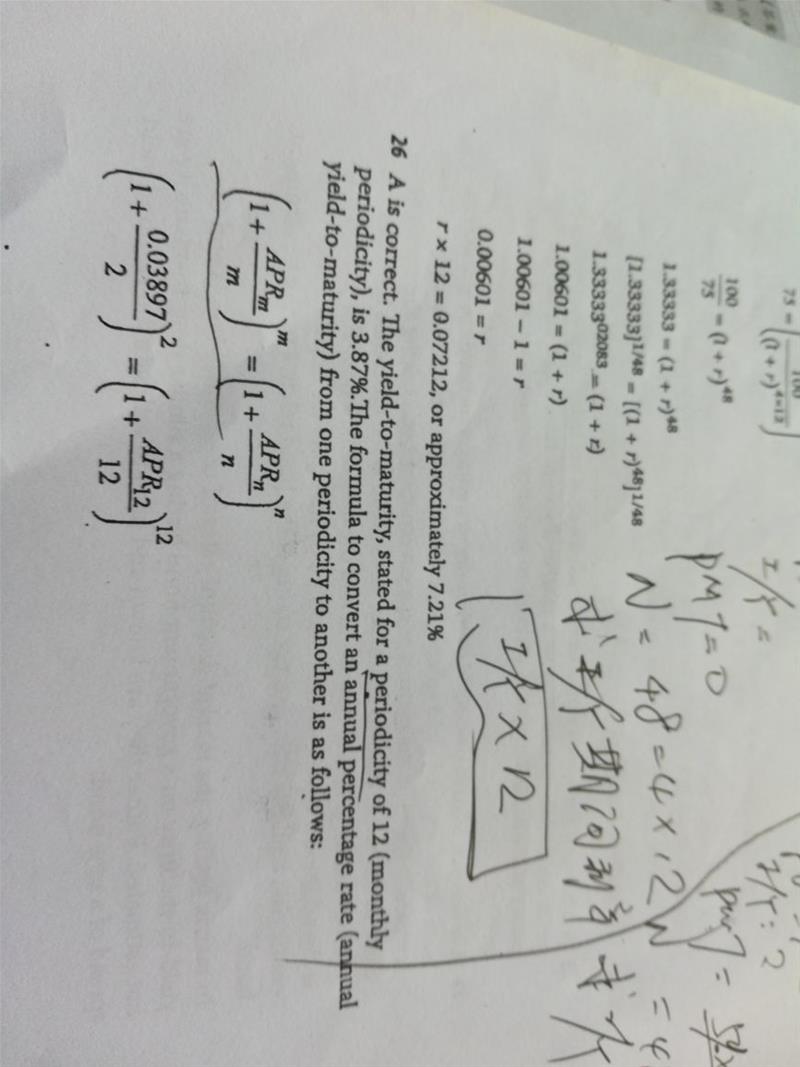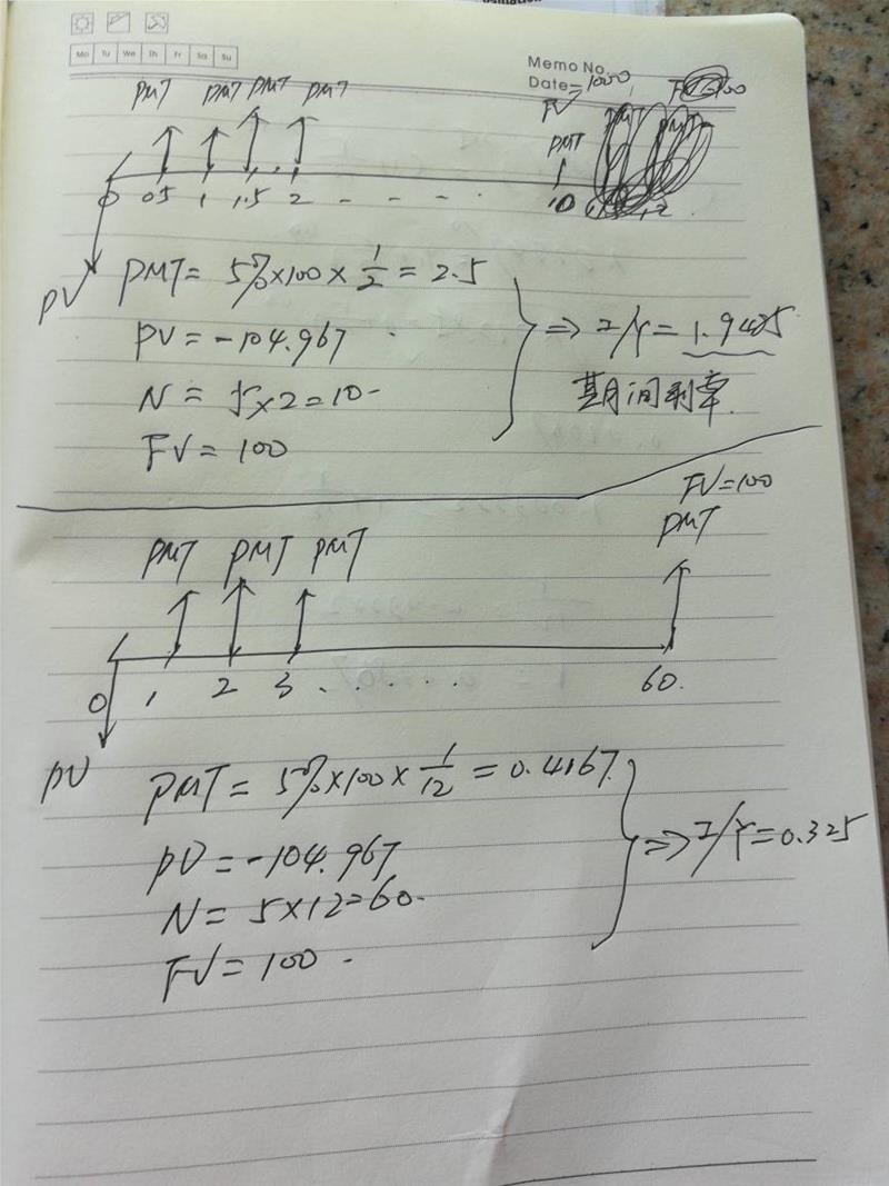 你好,关于原版书后题第250页第26题,我只能按照求年金(见我添加图片),但是对于解答里,为什么同样是滚5年,以不同的期间利率去计算,结果是一样的,这个公式不理解。是不是这样理解,因为债券的购买价格一样 面值一样,期限都是5年,5年总COUPON是一样,那唯一差别是中间的分红(间隔不同,每次分红金额不同),那解答里为什么有这个等式,是按照持有收益去做复利的结果一样?怎么理解,谢谢