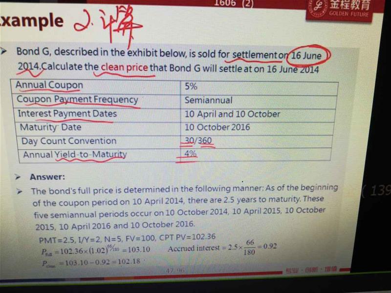 你好,是强化班47-96,其它我都理解了,为什么算2014.6.16Full Price 不能按照年化利率4%(复利,滚了66天,360天里面66天),如果我列出来,为什么要用半年利率(180天去算呢),已经知道年化利率,也知道一年360天,走了66天,中间也没有分红(66天之内)?同180天算法有什么逻辑不同,老师这里只是略提了下按照一期半年来计算。