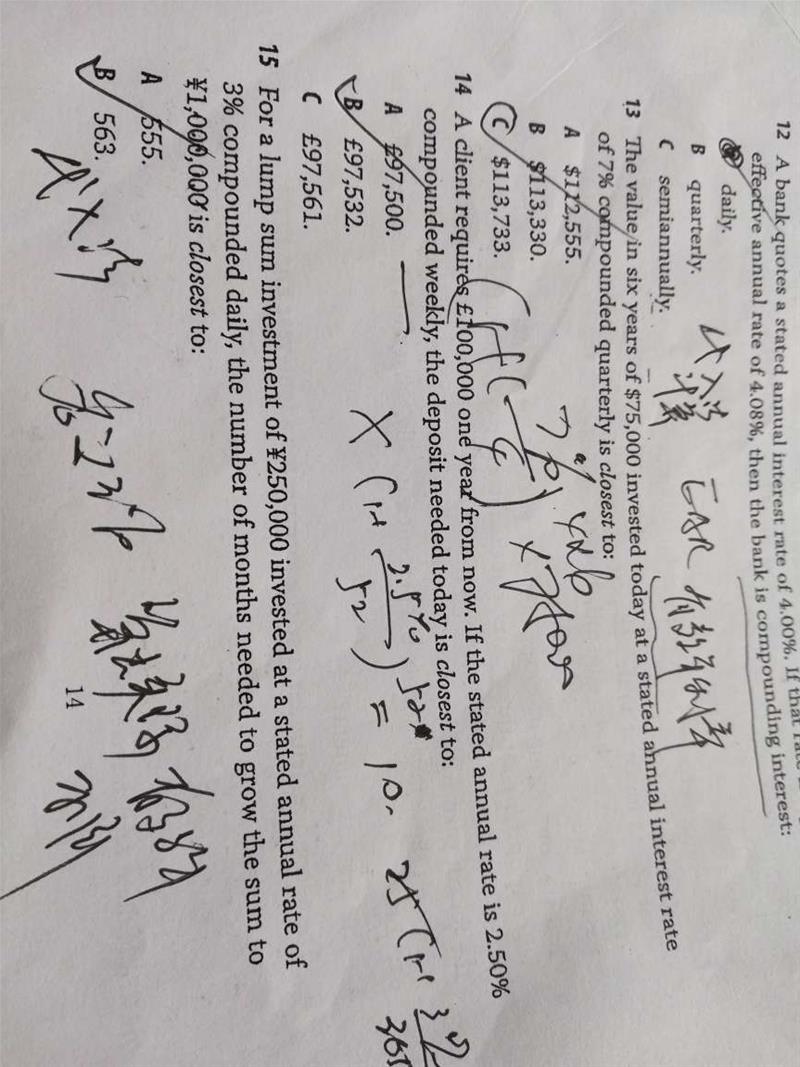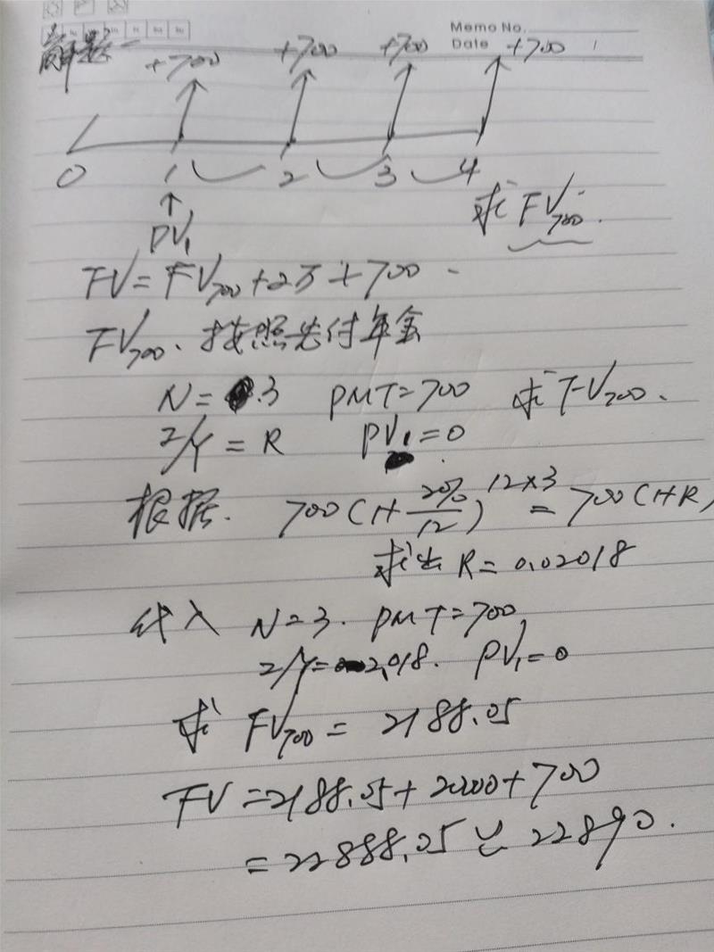 你好,对于原版书后题第16页第28题,我用了两种方法,是否可以,对于方法二,就是每一项硬算。我还用了方法一 我是这样理解的,对于700(20000*0.035%),也相当于一个三年期,定期现金流,每年年初付700,年利率假设是R,求三年后综值FV,那组合账户值就为20000(本金)+FV+700(700是20000的最后一笔利息,没有继续收益)。那我只要求出R,就可以根据金融计算器第三排键,PV(0),N(3),PMT(700),R,求FV。而R我是用类似无套利法则,按照月计算复利得出的收益和总体按照年应该是一样的(实际应该是不一样吧?),700(1+0.02/12)12*3次方=700*(1+R)3次方,求出R=0.02018,再代入金融计算器,得出22888.05和方法一是22885.9,可以得出为B。还有一个问题,即使是这个R(按年计算年利率),在第二个700投资时候,又有一些稍微不同了吧,但是对于解答二方法,如果很多式子,要一个个去计算,很花时间 请评论这样是否可以,谢谢。