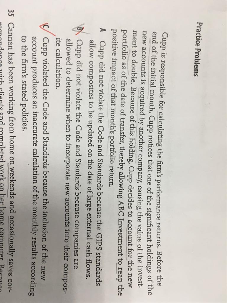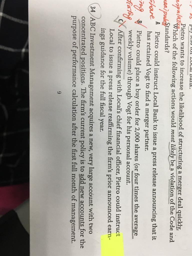 Machile, CFA, is the Managing Director for Business Development of a large U.S.-based Hedge fund organization. Machile recently approved unusual terms for the fund’s client agreement in order to secure business from a large hedge fund manager based in Asia. To allow for time zone differences, the agreement allows the hedge fund to trade six hours after the close of U.S. markets. According to the Standards of Practice Handbook, did Machile violate any CFA Institute Standards of Professional Conduct? A No. B Yes, because he failed to inform his other clients of the unusual terms under the new client agreement, thus not treating clients equally. C Yes, because he failed to review regulations on late-trading and did not consult with ABC’s compliance director to determine if late-trading was acceptable. 人家是 agreement allows呀,有什么违反的呀!