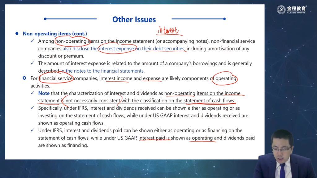 老师,这边下面最后两小段关于gaap下怎么在cash flow statement划分interest expense和dividend是不是写错了?究竟是operating还是financing?