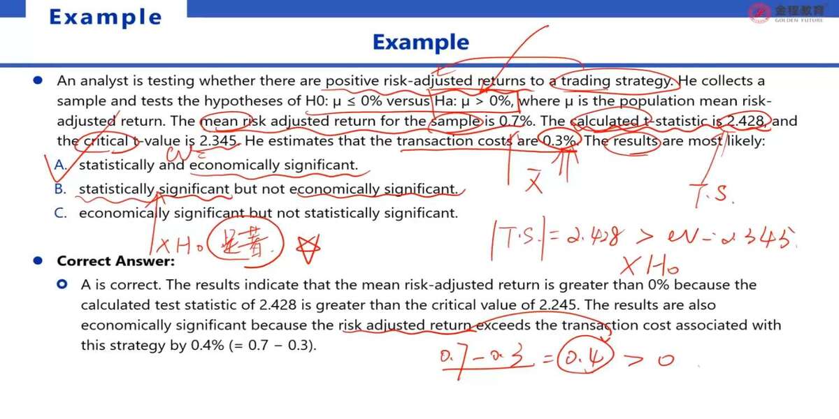这里没听懂,按理说拒绝原假设是TS落在拒绝域,拒绝域取决于样本均值-假设均值/SD, 落在拒绝域则说明具有显著性。 这里老师直接说样本均值-0.3=0.4是啥意思,按理说分子变小TS变小,那么有可能不落在拒绝域了呀,怎么就直接具有显著性了