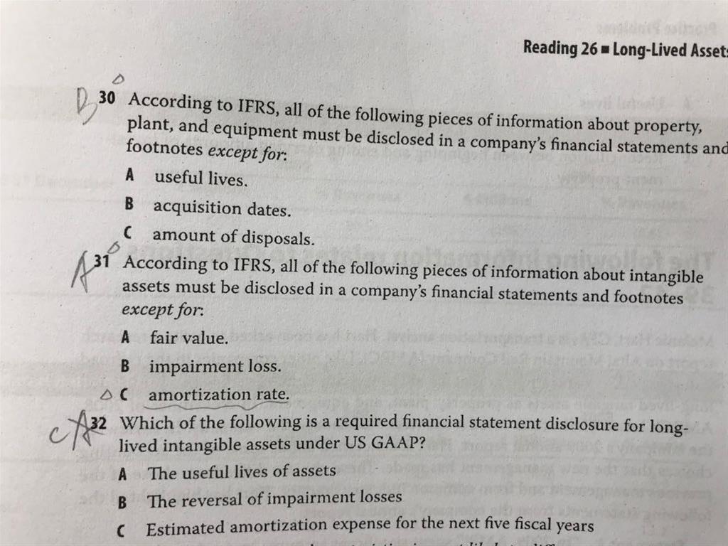 题目中出现IFRS和US GAAP下对于长期资产要披露哪些信息(图中30和32题),上课好像没讲过,老师能否总结一下: 1、IFRS下固定资产、无形资产分别要披露哪些信息 2、US GAAP下固定资产、无形资产分别要披露哪些信息