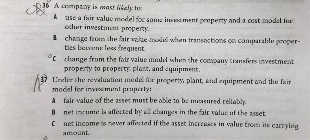 对于图中的题目: 1、36题的B选项为什么不对?如果交易不频繁,公允价值就不能正确反应资产的价值,把公允价值模型改为摊余成本法也是对的呀 2、对比36和37两题,36题的C选项是错的是因为固定资产不能用公允价值模型(即题目中认为公允价值和重估值不等同),但是37题的A选项又是认为公允价值和重估值是等同的(表述为fair value),那么这两个到底是可以认为等同的吗?考试时应该怎么认为和处理?