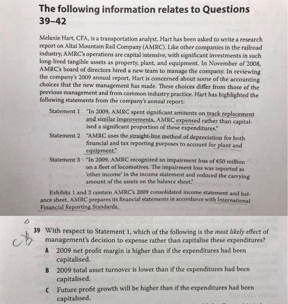 对于图中的39题,答案给的是C,但是答案是不是错的,感觉应该选B 如果支出资本化了,资产增加,平均资产增加,那么总资产周转率就是减小的 如果支出资本化了,那么由于以后年份会有折旧或摊销费用计入利润表,未来的利润是比费用化低的