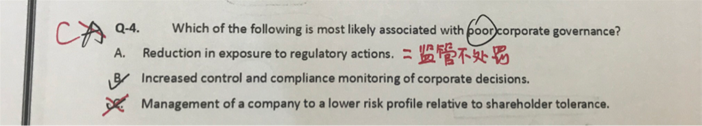 AC没有很明白。自己做的时候,觉得A的意思是公司外部的监管少了,应该是被监管少,所以会poor,没有很好的外部监管与内部进行配合。C不可以理解成股东可接受的risk会高于目前公司的risk profile吗?那不是能说明公司管理好,所以能把risk降低到一个股东可接受最高risk下面吗?