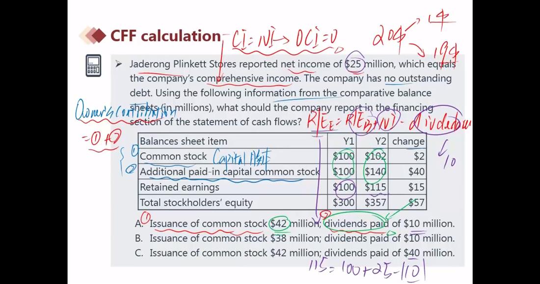 老师,这题如果还有dividend payable为2 million 的条件,dividends paid是否应为-dividends paid=-dividend decleared+Δdividend payable=-10+2=-8, dividends paid计算结果为8 million? 谢谢!