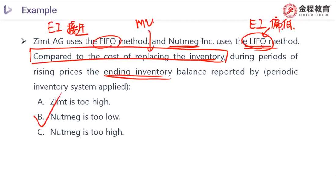 老师,1. 本题怎么样才能正确理解到它compared to the cost of replacing the inventory的意思是和市场价值比较呢,我get到的是“如果把现有的存货用市面上的货替换掉(replacing)”。2. 如果真的问“如果把现有的存货用市面上的货替换掉,哪家的ending inventory balance高/低”,答案应是什么?谢谢!