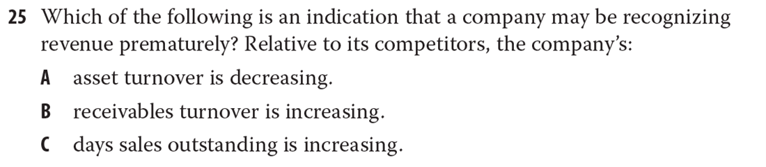 已回答原本书课后题:我想问答案为什么不是A? Asset turnover = total sales / average assets; Receivables turnover = total sales / average receivables - 如果revenue is recorded prematurely,意味着今期revenue会跌,那么两个ratio的分子都会跌,所以两个ratio都会decrease。那为什么答案只选C而不是A呢?