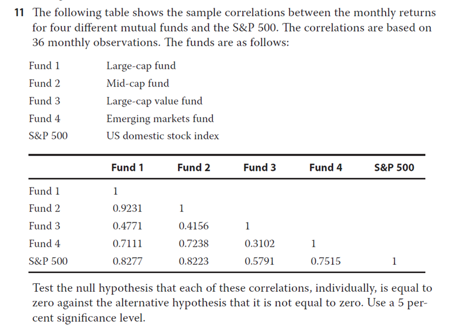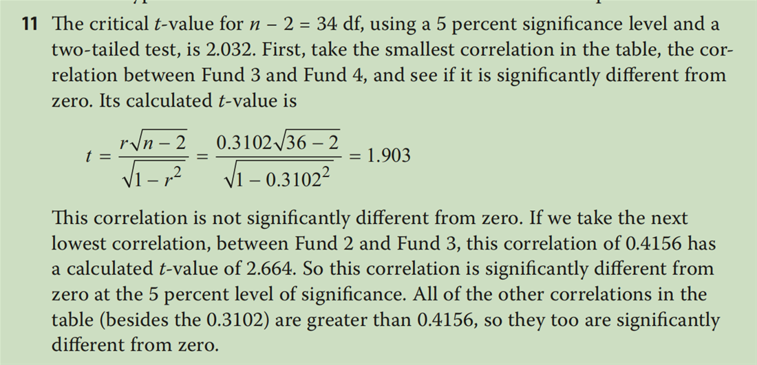 Q11 这道题算出来的t值是1.903,然后在A=5%下的查表值是2.032,那么不应该拒绝原假设,P=0 是对的,但是后来答案又选了其他的correlation值,算出来又应该拒绝原假设,那到底这道题的正确答案是什么呢?