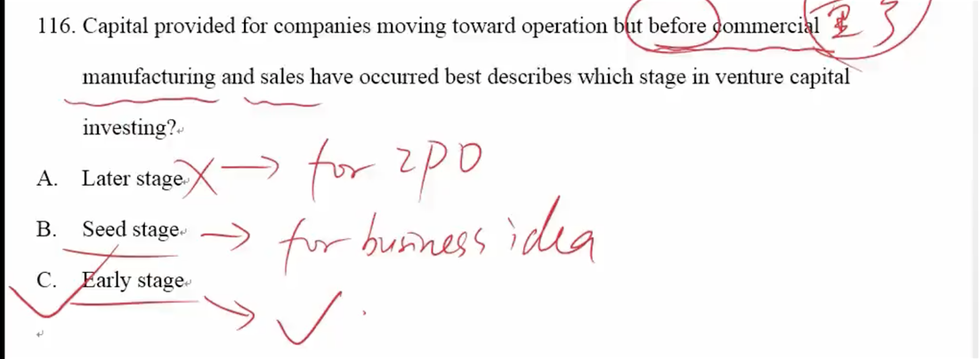 老师好!这道题视频中老师的讲解是否有误?seed stage应该是已经将business idea转化成了实际的商业计划之后,进行产品的研发或市场营销了吧?老师讲的business idea应该是angel investment吧?