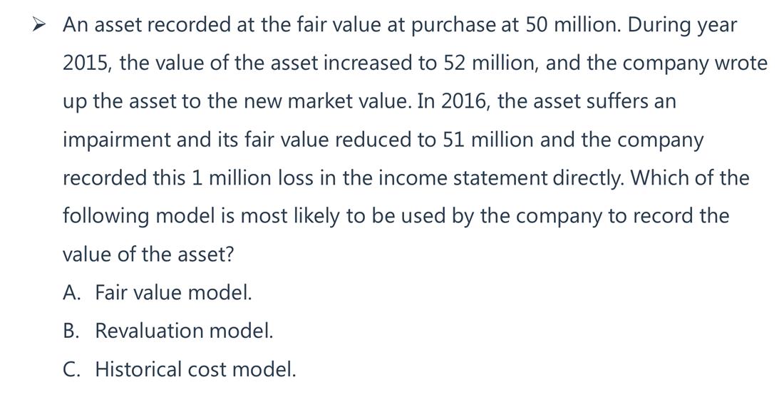 老师, 这道题目为什么一定是FV model呢?从50-52,在FV model和revaluation model下都可以实现啊;另外FV model下gain and loss都是进入I/S表,revaluation model下loss进I/S,gain进OCI. 那仅凭1 million loss进入I/S表,怎么就判断一定是FV model呢? 谢谢