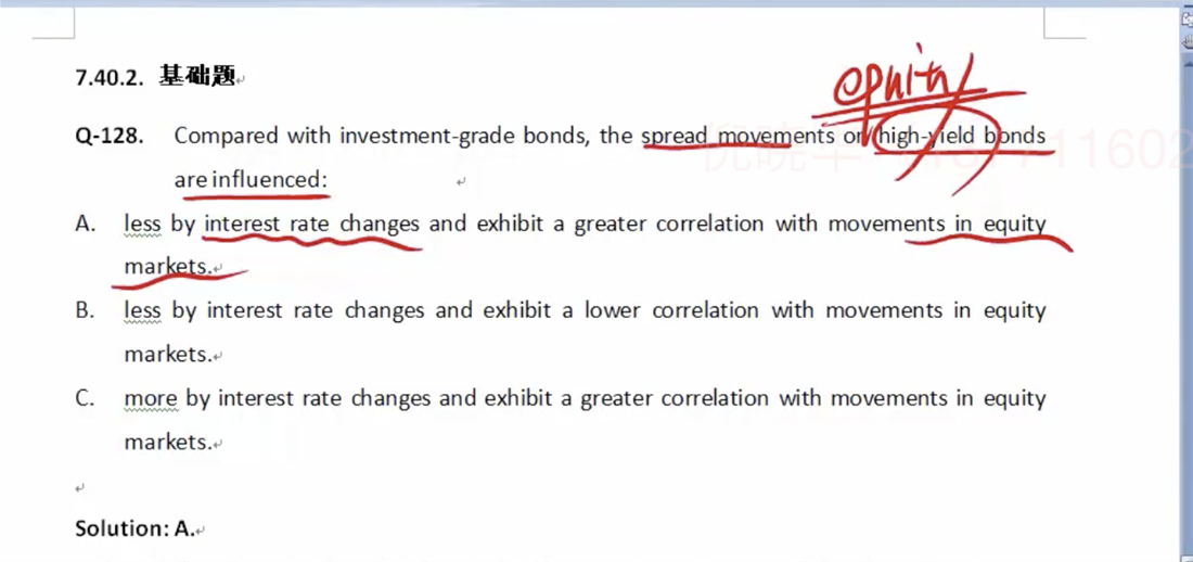 已回答Q13:两个otherwise equal的bond,也就是assume par value,required rate of return, 期数 都一致;然后一个是fully amortizing,一个是partially amortizing。Principal repayment = coupon - interest expense. 第一期开始,因为两支bond的MR和PRN都一样,那么interest expense也会一样。如果Fully amortizing的那支bond的coupon没有比Partitially amortizing的那一支更高,那根本不会偿还更多的principal,没办法达到fully amortize的效果呀。