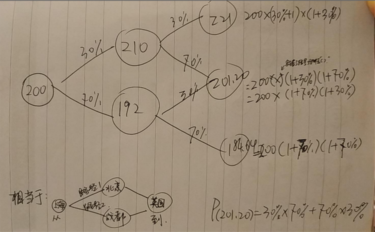 这个老师的回答中,最右边几个式子 200*(1+30%)(1+70%) 为这个200乘以这个概率,是什么意思?不理解 以及最后42怎么算出来的,为什么就变成了 0.3*0.7+0.7*0.3了? 是怎么从上面几个圈圈得到下面的?