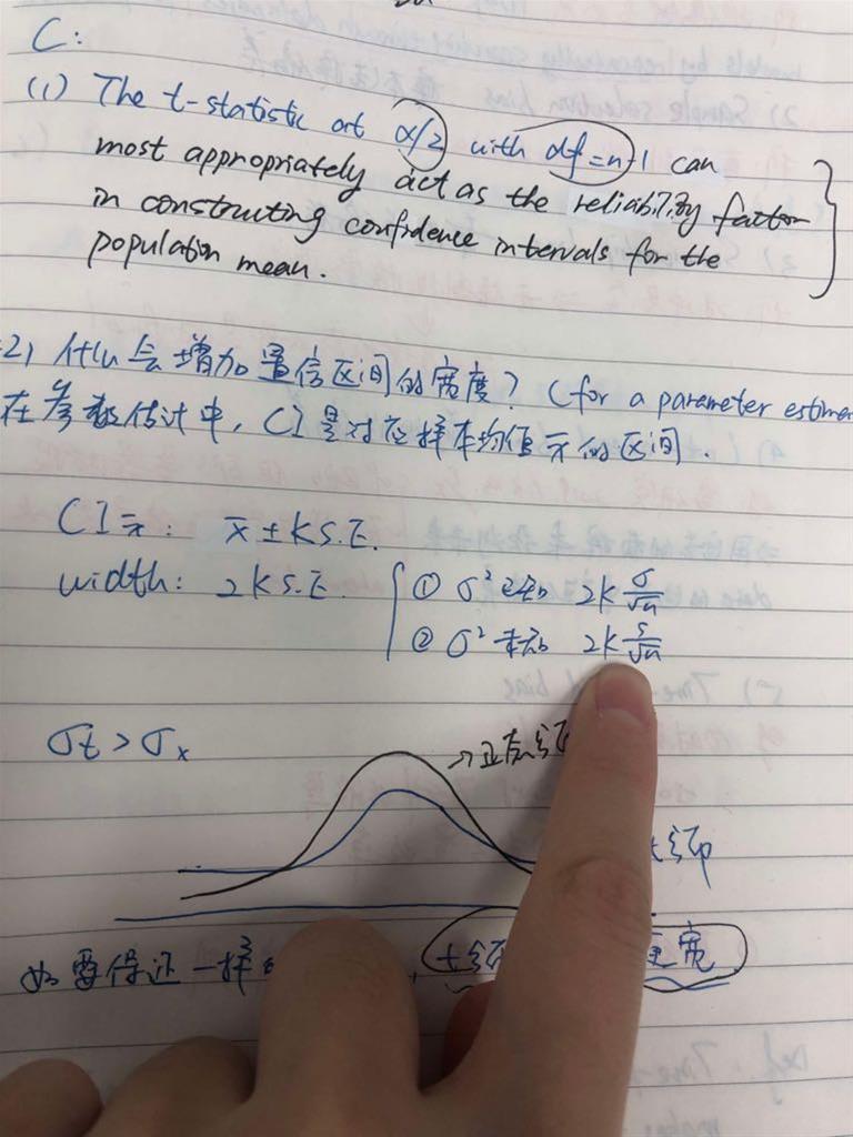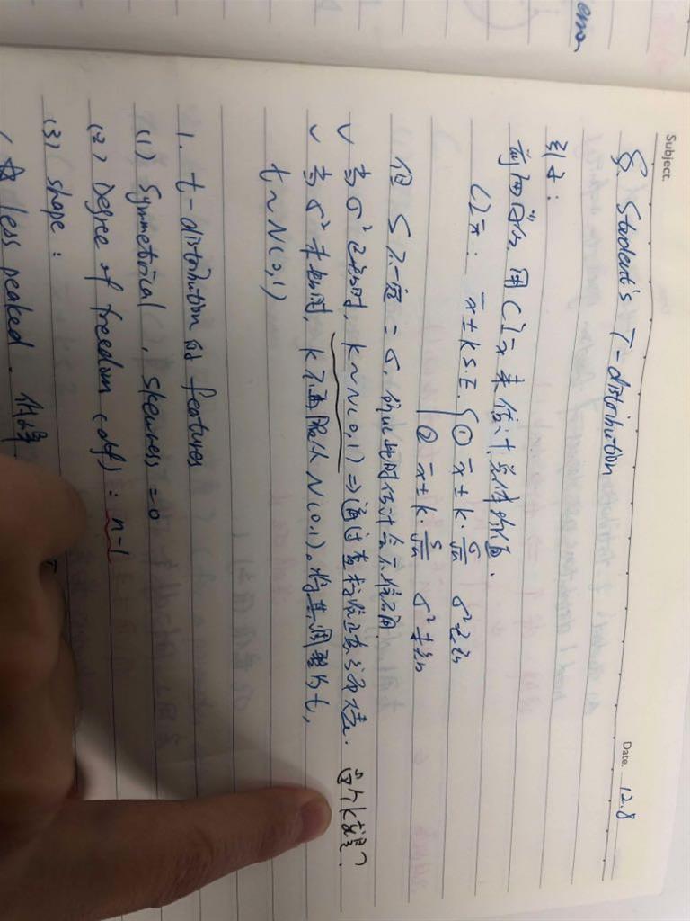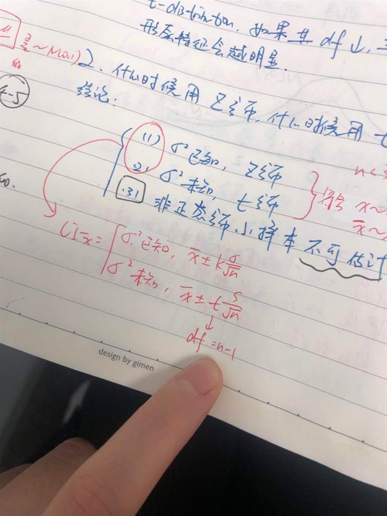 老师,我的笔记出现了不一样的地方。 样本均值的置信区间,在知道和不知道方差的情况下,公式到底是什么? 图1 ,不知道总体方差的时候,系数写的是t(下面还写了df=n-1,为什么) 但是图2,不知道总体方差,系数写的还是k(就是z分布吗?z-value?) 到底是啥啊…
