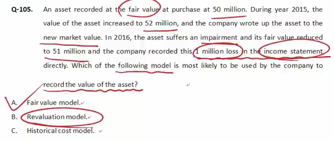 根据revaluation model,surplus 计equity,loss 计 I/S;fair value model, gain/loss 都计 I/S。 题干中只说到loss进I/S,为什么可以判定就是fair value model