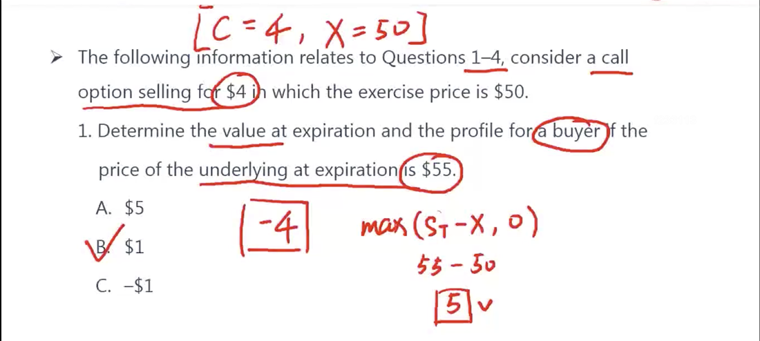 老师好! 这道题里面要求value, 即option value,option value在到期日的时候不是应该只等于intrinsic value吗?这道题中intrinsic value=55-50=5,为什么最后在计算option value时还要扣除期权费的4呢?这不就相当于在求这个buyer的profit了吗?