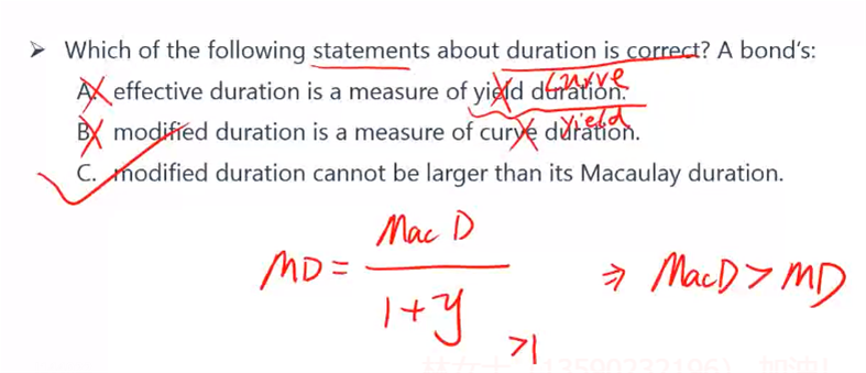查看试题 已回答第一个图片:主要是久期公式有疑问,修正久期的公式是-△%p/△y,带了符号,为什么在换算money duration和PVBP的时候就没有了负号? 第二个图:yield duration和curve duration的区别是什么?