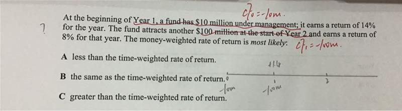 老师麻烦详细讲解一下这道题,答案上写CF0为-10,CF1为-100,在t=1时间点上不是会有1.4的return吗?为什么算CF的时候不算两者净值?