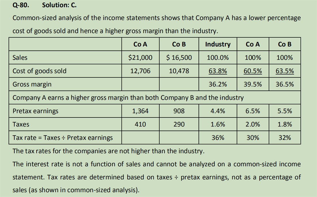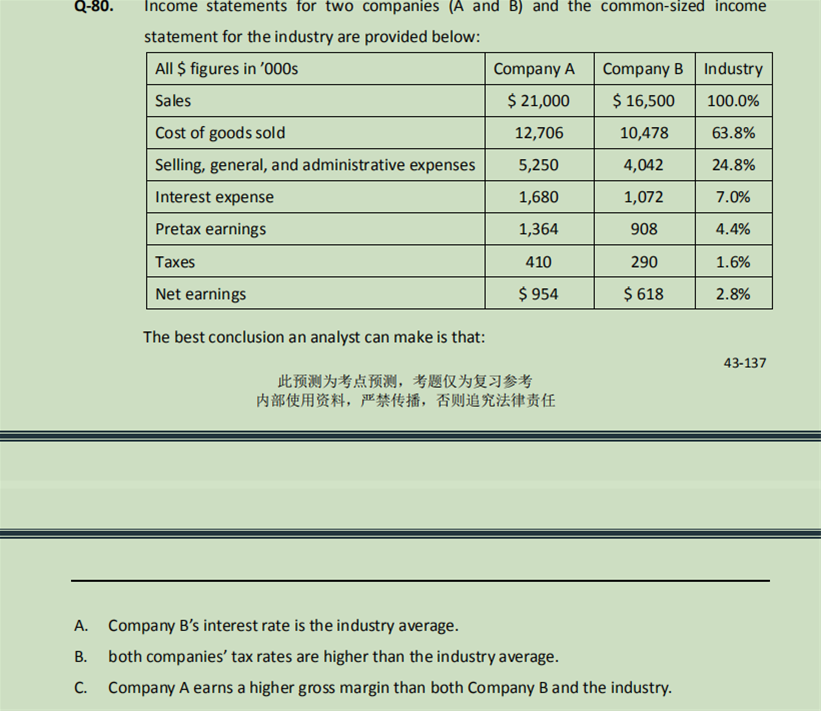 这道题我的解题思路是把三个选项都计算出来,再进行比较。但是答案的A选项是说在common-sized IS 里面没有Interest rate可比较,但是如果这个逻辑成立的话,B选项下的tax rate 也无法在common-sized IS里面显示呀,但是答案计算公式里面的tax 确实用common-size来表示的,所以这个解释有点自相矛盾。