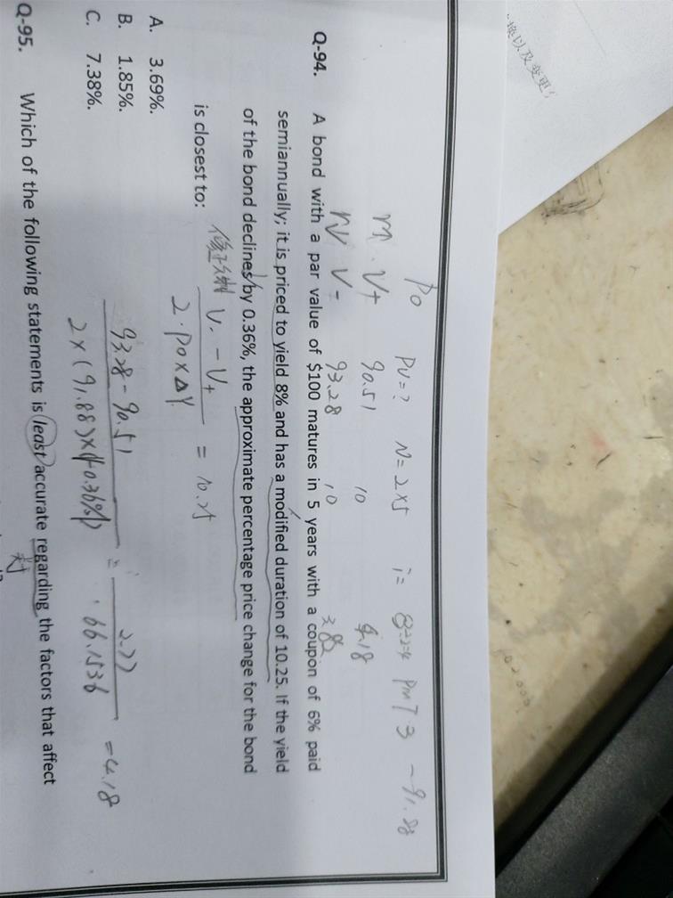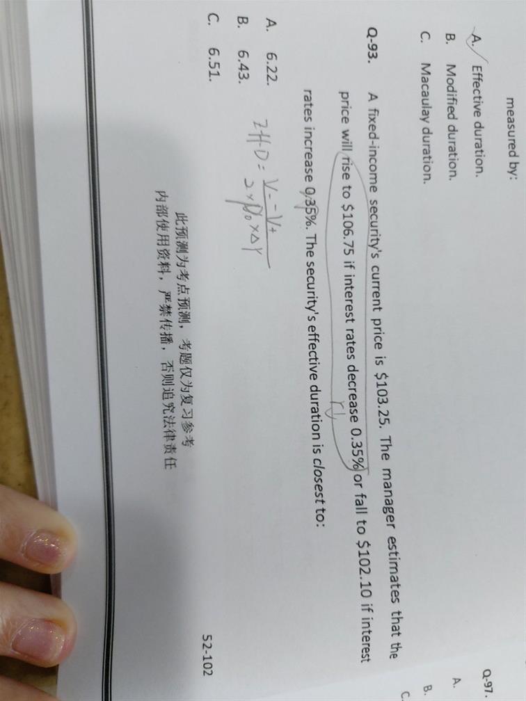 固收 94老师这道题问的修正久期变化多少?那我把利率变动的pv求出来,事后再计算修正久期 再相减 对吗?