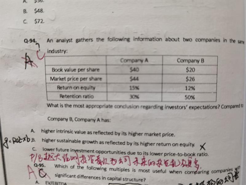 94题,P/B和P/E不都是应该越小越好嘛?为什么P/B越大投资者会认为未来上升空间更大。