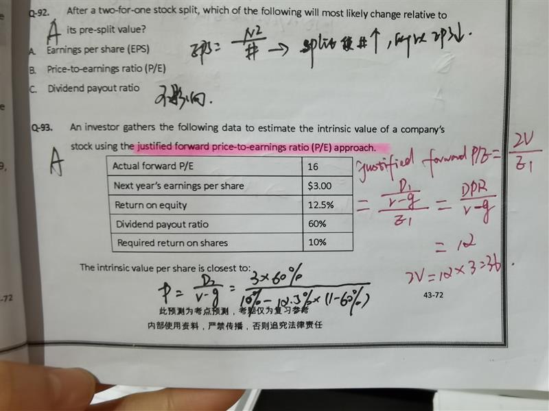 93题,为什么不直接代公式P=D1/(r-g),而要先算justified P/E,再乘以E1求P呐?有什么不一样吗?