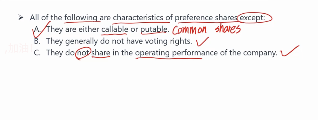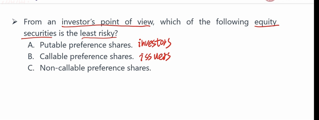 老师好!关于优先股是否含权这个特点,在本reading的经典题里,图1中的题表明了优先股是不含权的,即没有callable和putable这个说法,讲解老师也说了这是common shares普通股才有的特点;但是图2中的题,为什么又是putable preference shares的风险最小呢,按照图1中的题的说法,应该不存在putable的优先股的吧?