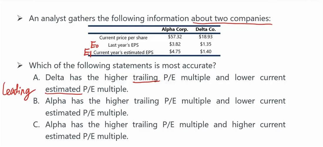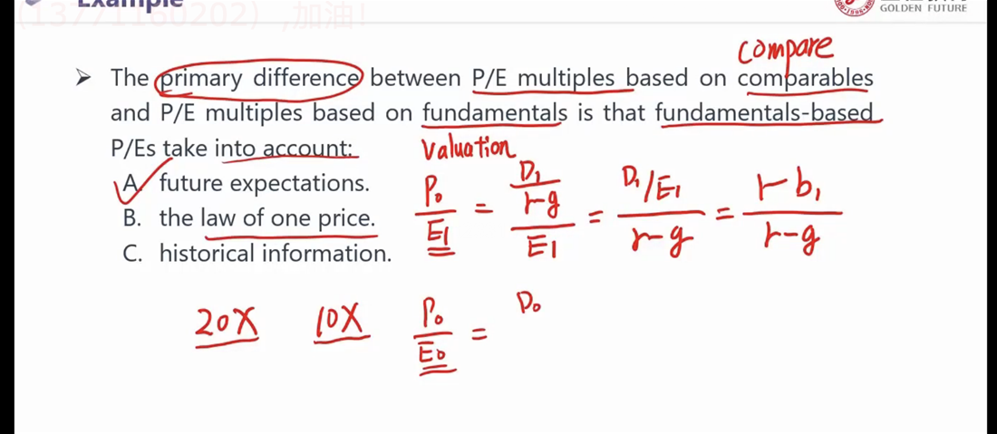 已回答老师好!关于这道题的解析,视频中老师说based on fundamental是专注于估值的,所以采用P0/E1,即动态市盈率,而based on comparables是专注于比较的,所以采用P0/E0,即静态市盈率。关于这个问题,我以前发起过类似的提问,提问老师回复说不论是Leading P/E还是Trailing P/E都是justified P/E,即其中的P都是通过股利折现模型所求得的,即这两种P/E都是用来估值的,即based on fundamental。但是based on comparables所使用的P/E中的P是股票当前的市场价值,未采用估值模型求得。所以视频中老师的讲解是有问题的吗?